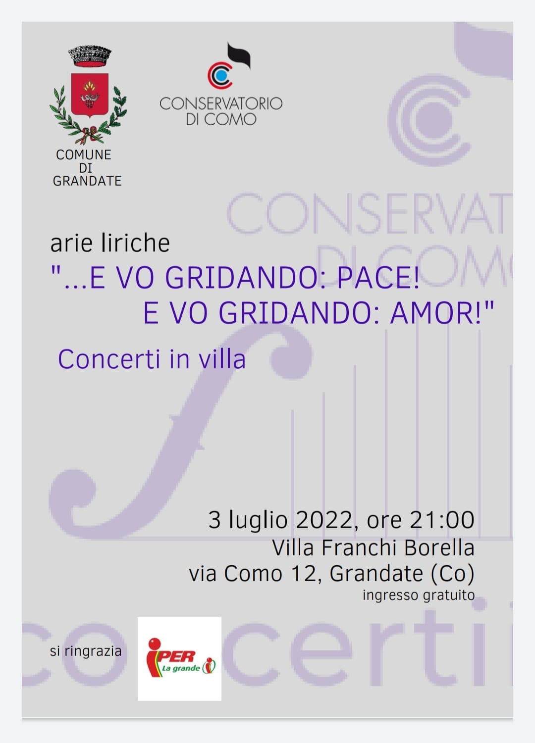 Domenica 3 luglio presso il Cortile della Villa Comunale Franchi Borella il Conservatorio di Como porterà un concerto con alcune tra le arie liriche più famose.