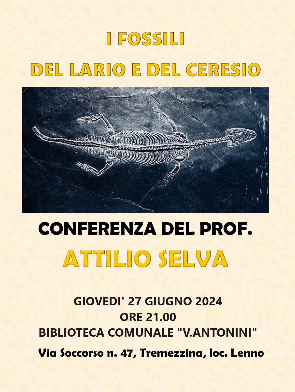 Giovedì 27 giugno 2024, alle ore 21.00, il prof. Attilio Selva terrà una conferenza dedicata alla scoperta dei fossili del Lario e del Ceresio.