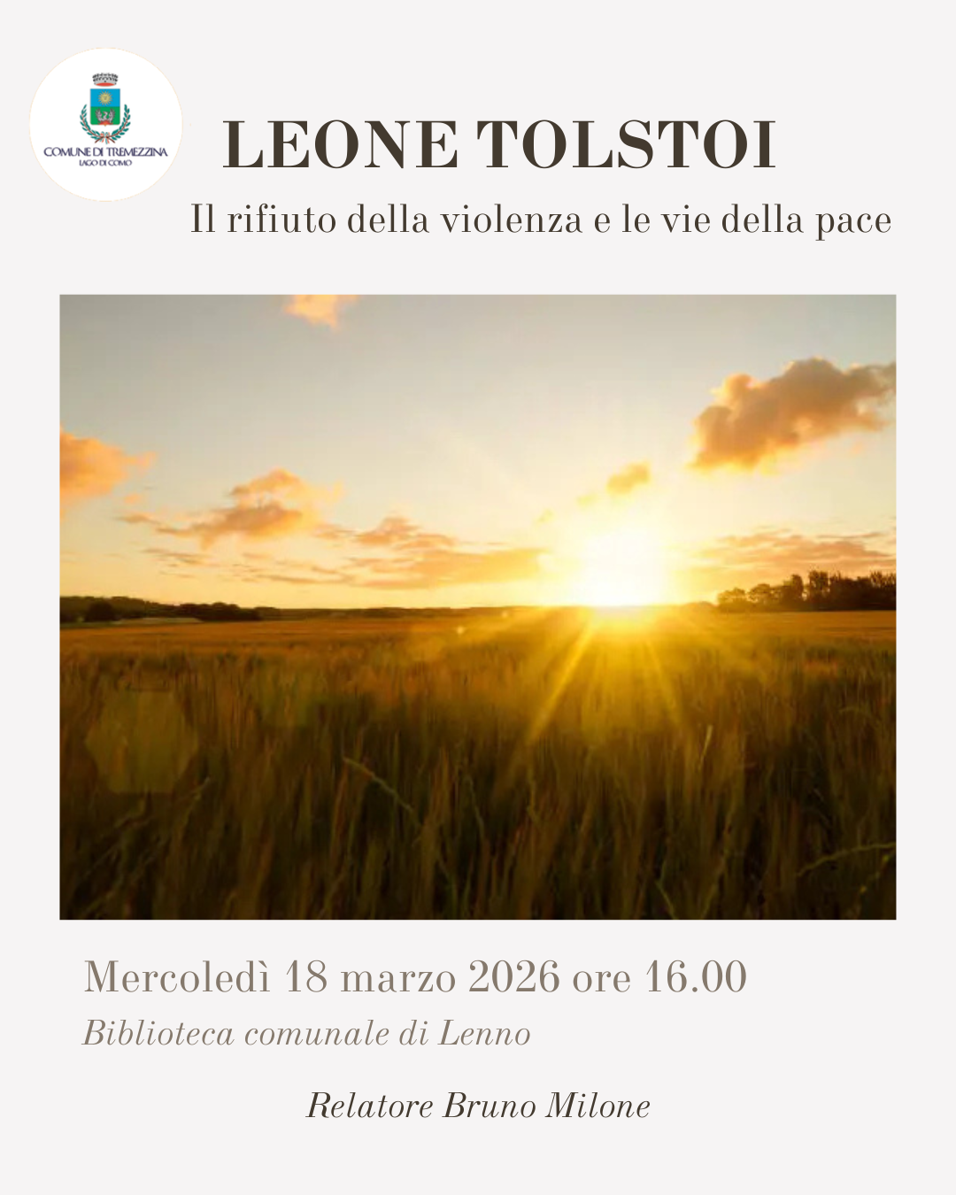 Mercoledì 18 marzo 2026, alle ore 16.00, la biblioteca comunale "V. Antonini" in località Lenno ospiterà la conferenza "Leone Tolstoi. Il rifiuto della violenza e le vie della pace".