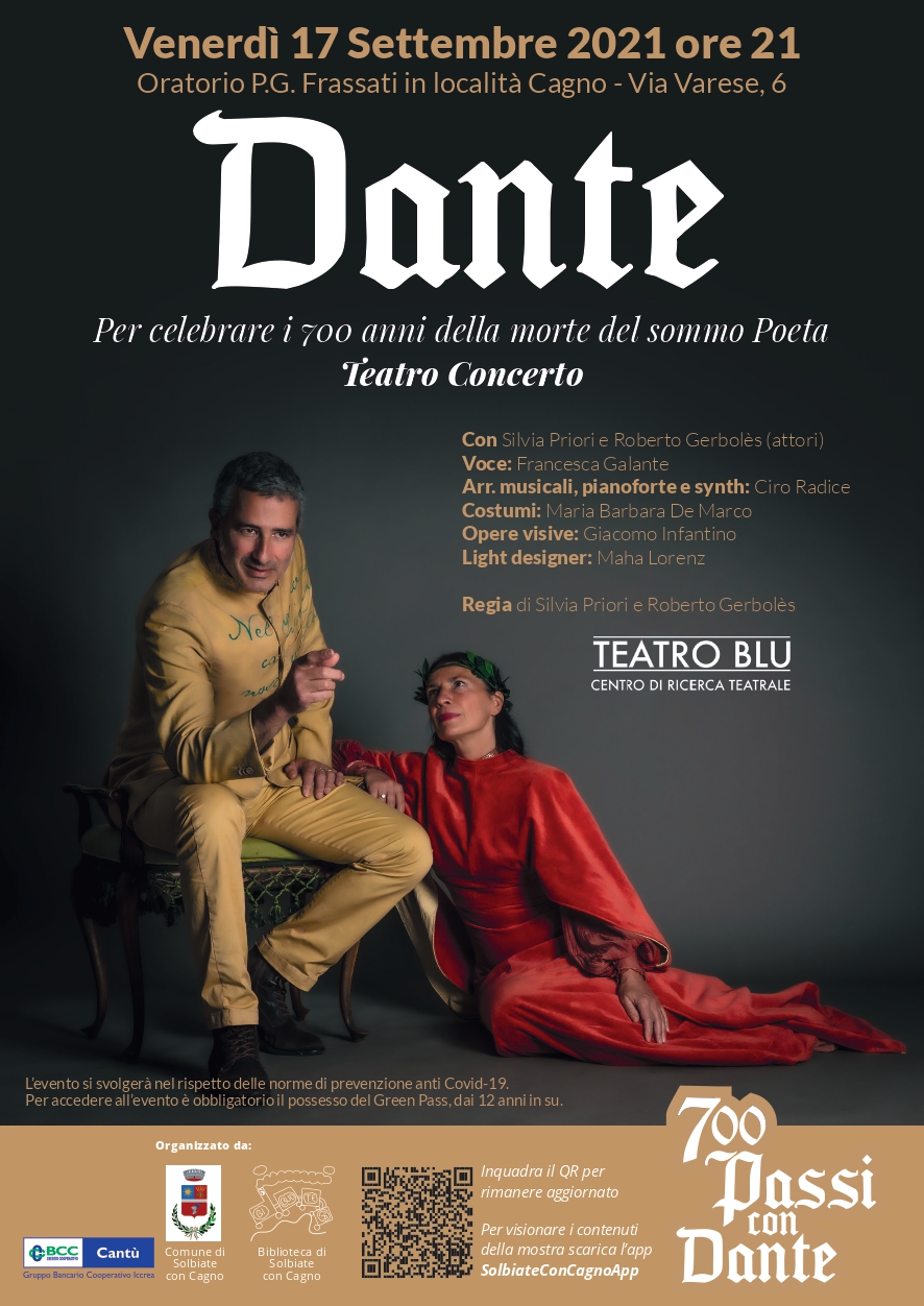 Per celebrare i 700 anni dalla morte del Sommo Poeta, proponiamo un teatro concerto a cura di Teatro Blu. Venerdì 17 settembre alle ore 21.00 presso l'Oratorio in località Cagno. Ingresso libero con obbligo di green -pass dai 12 anni in su.