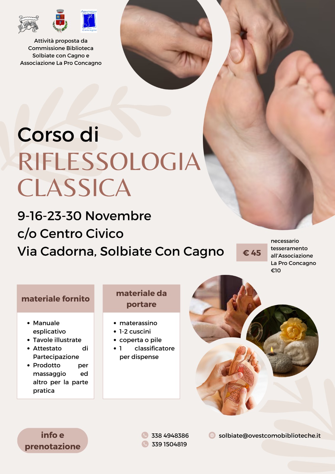 Corso di riflessologia classica in quattro incontri a partire da giovedì 9 novembre e fino a giovedì 30 novembre, alle ore 20.30 presso il Centro Civico via Cadorna, Solbiate con Cagno - località Concagno.