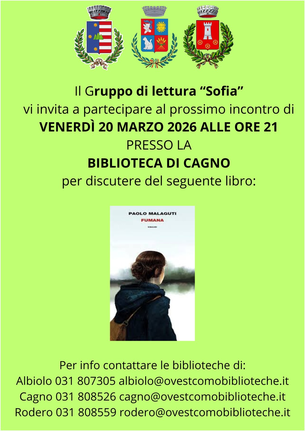 Incontro del gruppo di lettura SOFIA: venerdì 20 marzo alle ore 21 presso la Biblioteca di Cagno. Ingresso libero.