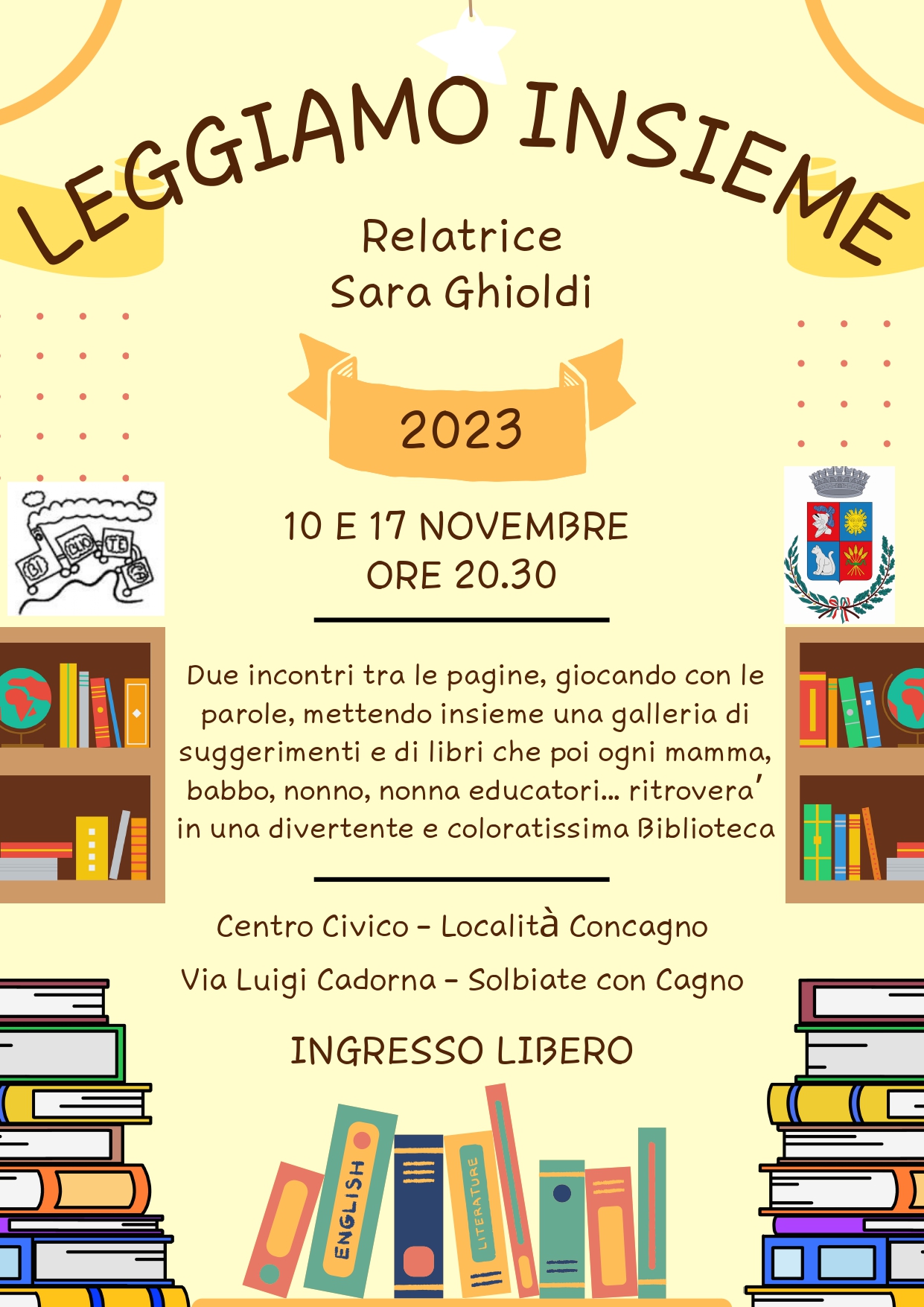 Leggiamo insieme: un percorso rivolto a mamme, papà, nonni, nonne, educatori e a tutti coloro che vogliono entrare nel magico mondo dei libri 0-6 anni. La specialista Sara Ghioldi proporrà un percorso di approfondimento che spazierà dalla scelta dei libri alla lettura ad alta voce. Gli incontri si articoleranno su due serate venerdì 10 e venerdì 17 novembre alle ore 20.30 presso il Centro Civico in via Cadorna a Solbiate con Cagno (località Concagno).