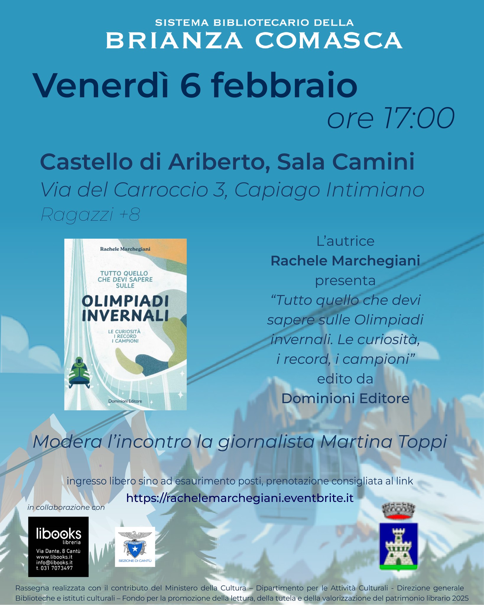 Venerdì 6 febbraio 2026, alle ore 17,vi aspettiamo presso la Sala Camini del Castello di Ariberto per la presentazione del libro Tutto quello che devi sapere sulle Olimpiadi invernali. Le curiosità, i record, i campioni. L'incontro fa parte della rassegna Accendi con noi La Torcia Olimpica! Libri e Sport nelle biblioteche del Sistema Brianza Comasca in occasione di Milano Cortina 2026, organizzata dal Sistema Bibliotecario e finanziata dal Ministero della Cultura, su presentazione di progetto al bando "Fondo per la promozione della lettura, della tutela e della valorizzazione del patrimonio librario 2025" ed è realizzata in collaborazione con la libreria Libooks di Cantù e con il coinvolgimento del CAI-Sezione di Cantù. Ingresso libero e gratuito fino a esaurimento posti; prenotazione consigliata al link https://rachelemarchegiani.eventbrite.it Per informazioni: Sistema Bibliotecario della Brianza Comasca: info@brianzacomascabiblioteche.it, 031 717429 ; Biblioteca Comunale Ettore Bianchi di Capiago Intimiano: biblioteca@comune.capiago-intimiano.co.it, 031 4630327.