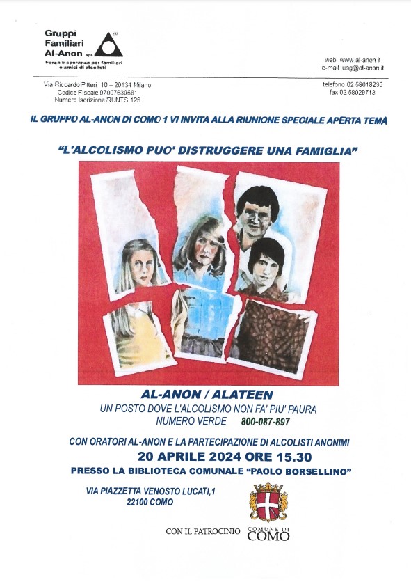 Con il patrocinio del Comune di Como, il gruppo comasco di Al-Anon organizza un incontro aperto sul tema dell'alcolismo