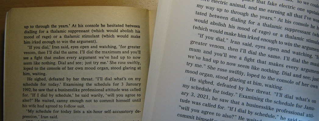 (*) Si possono confrontare, per esempio, due edizioni, entrambe del 1996, quella di Harper Collins (sul frontespizio: Do androids dream of electric sheep? filmed as Blade runner), che ha l'anno 1992 (p.8), e quella di Del Rey, che ha invece l'anno 2021 (p.4) (v. immagine qui sotto).